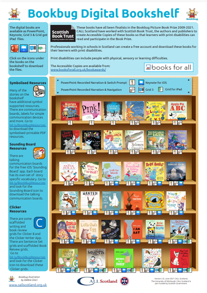 For quick access to all our previous years’ accessible books and symbolised resources, our Bookbug Digital Bookshelf has clickable links to 35 Bookbug books and our symbol resources archive.