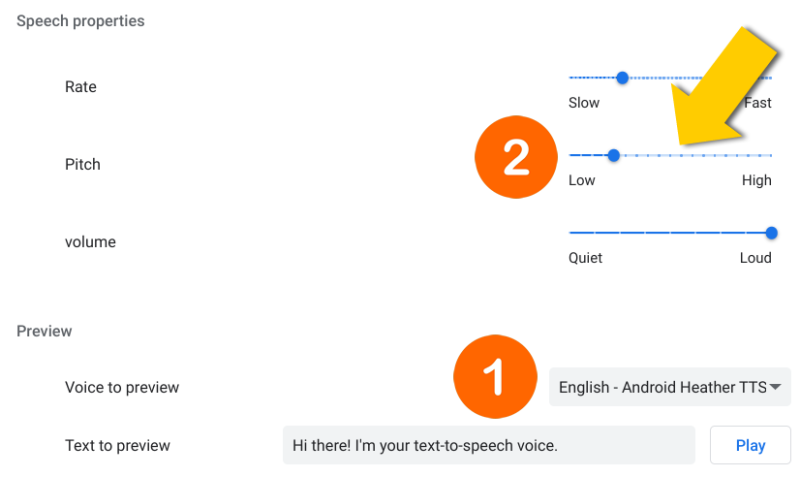 Select the Play button to listen to the voice. If you need to tweak the voice try adjusting the Pitch, e.g., 100% is the default setting for a natural-sounding voice otherwise it will sound very robotic - a bit like Darth Vader ??!